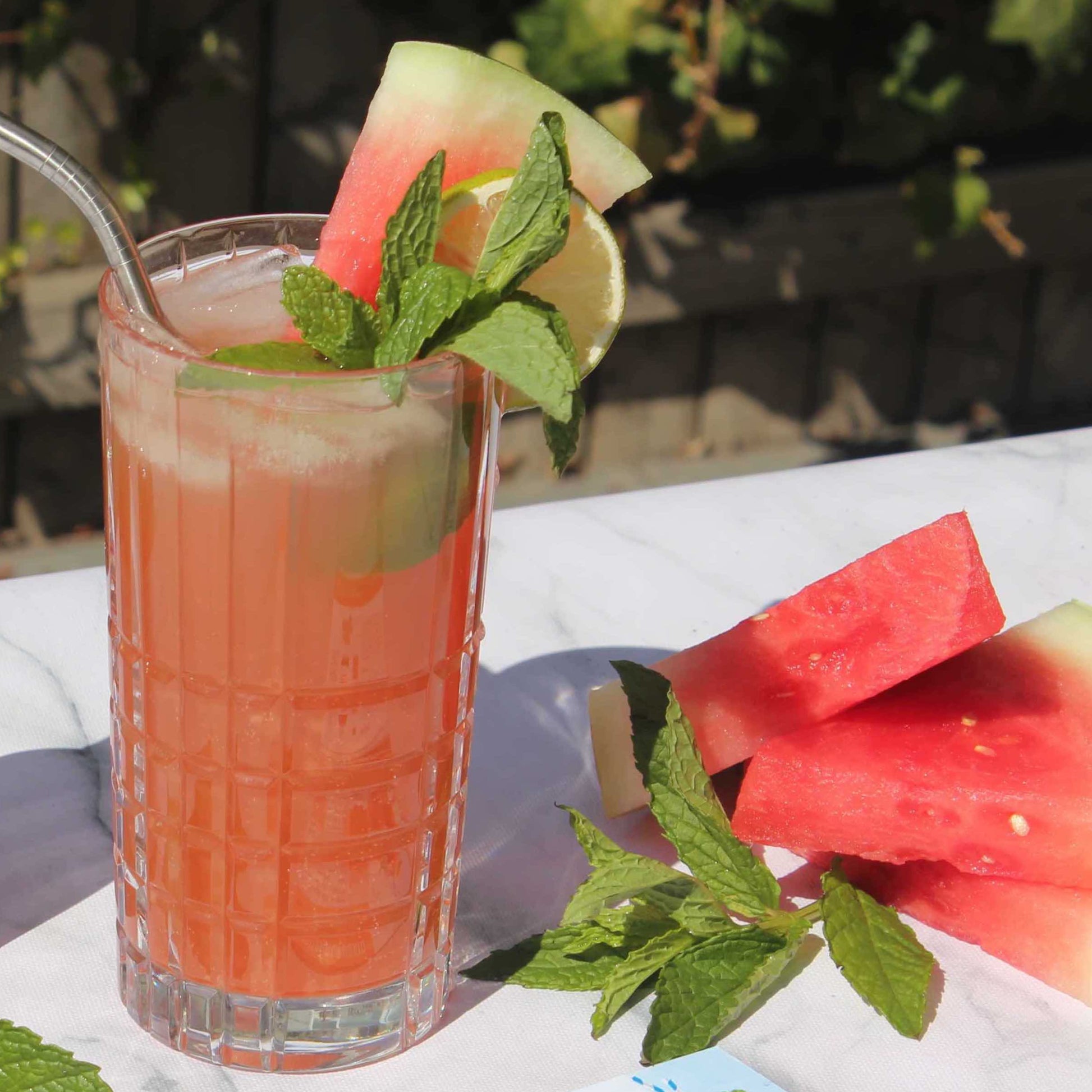 Add 2 oz rum, 1 oz watermelon & mint syrup, and